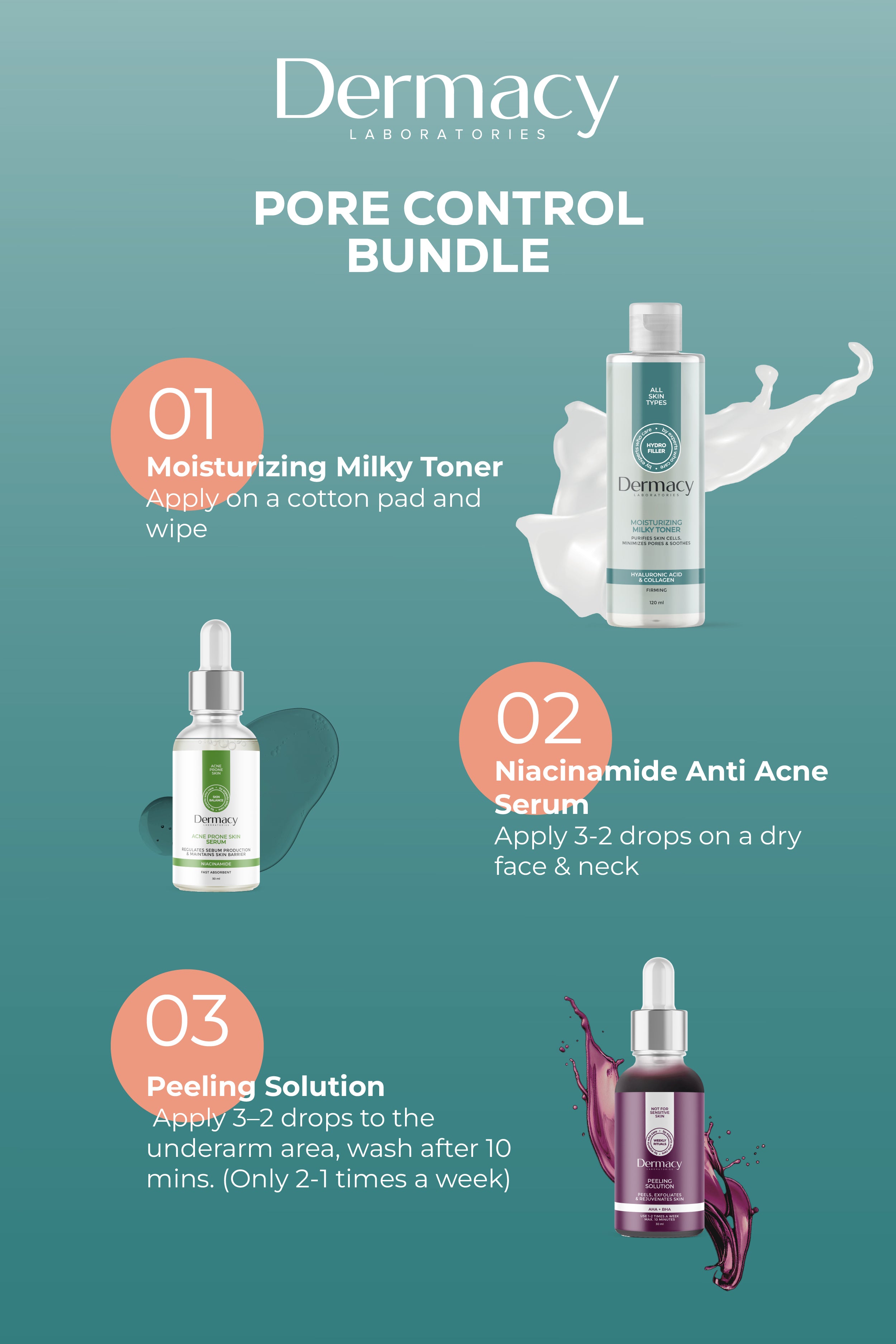 للحصول على سعر خاص، احصل على مجموعة التحكم في المسام لدينا، والتي تشمل سيروم مكافحة حب الشباب، محلول التقشير، والمرطب الحليبي.