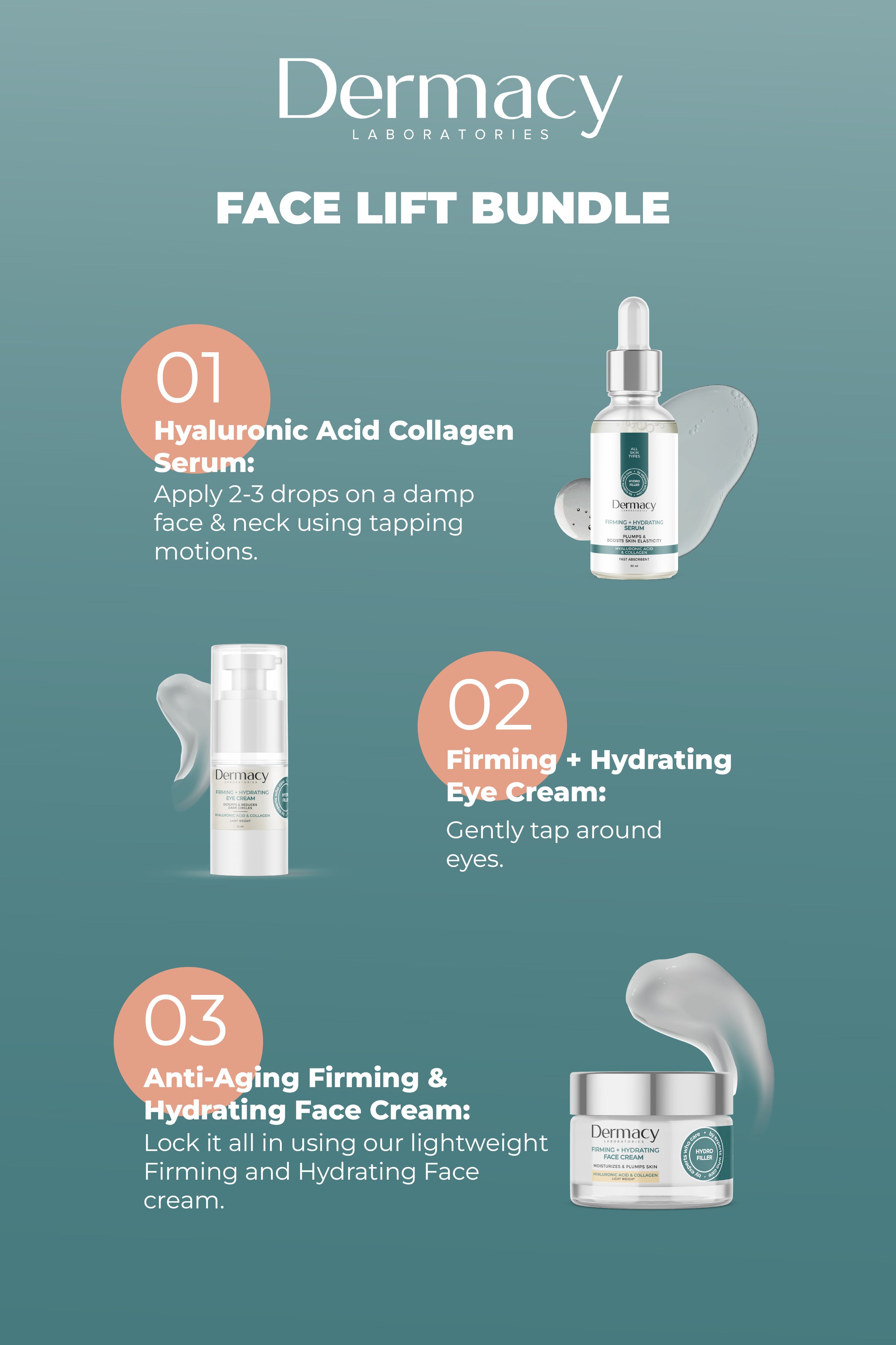 For a special price get our Face-Lift Bundle, which includes our Firming + Hydrating Face Cream, Eye Cream, and Serum.