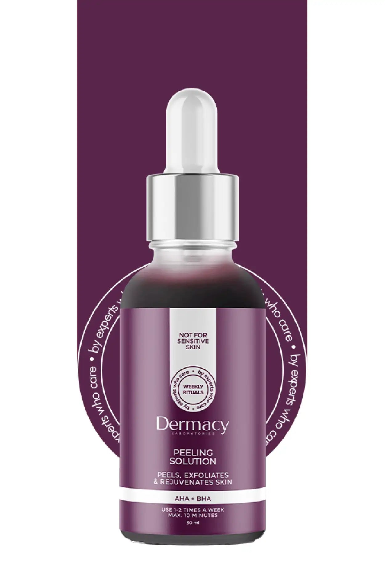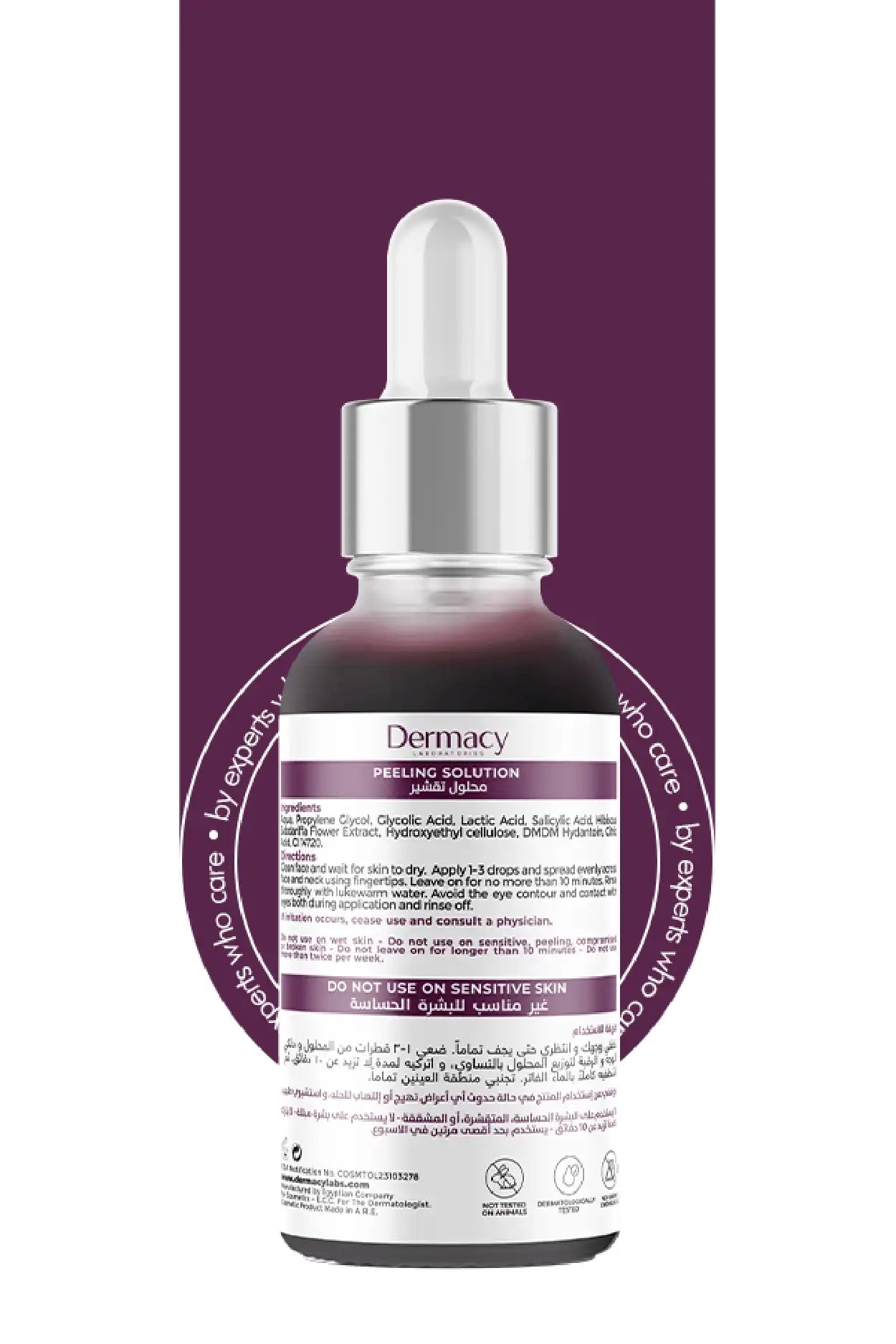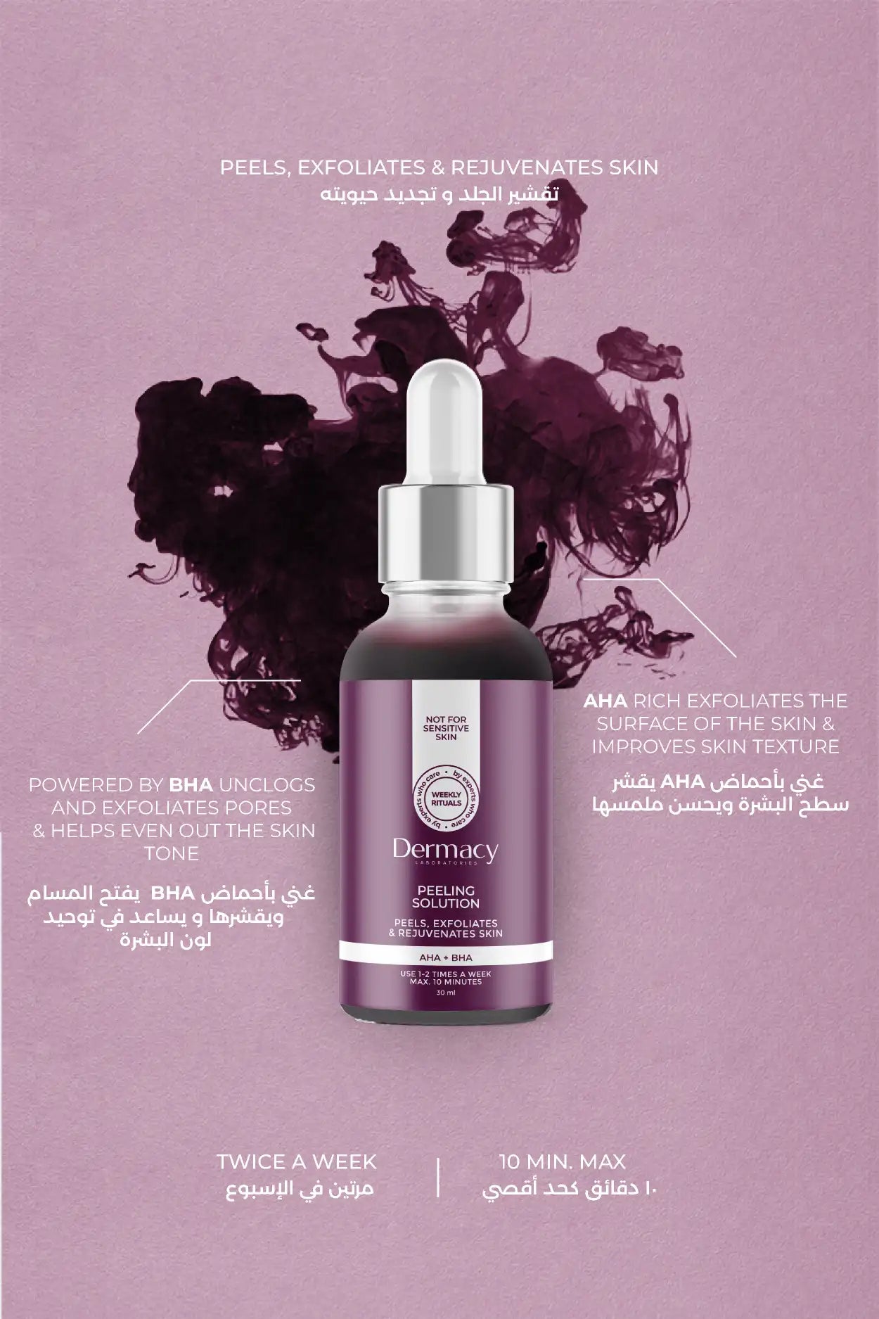 The Dermacy Peeling Solution is a weekly skin peeling, exfoliation, and rejuvenation procedure. At Dermacy Laboratories we believe in the power of combination. This formulation is enriched with AHA and BHA, which act together to smooth out the skin texture, stimulate the shedding of dead surface skin cells, and keep the skin moist, plump, and renewed. We always recommend consulting your doctor or dermatologist before using any product during pregnancy or breastfeeding. A full ingredients list is available on each product page and on the product packaging.